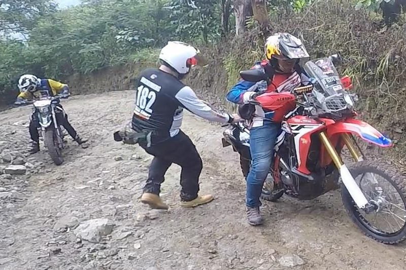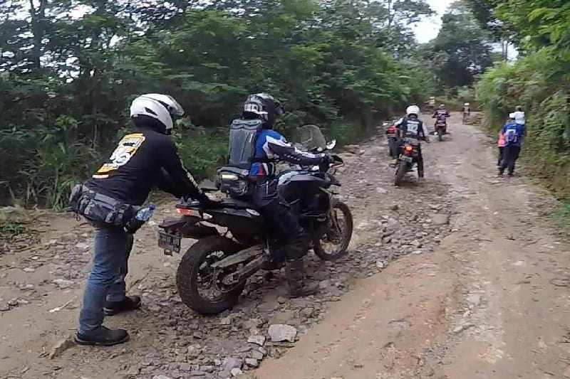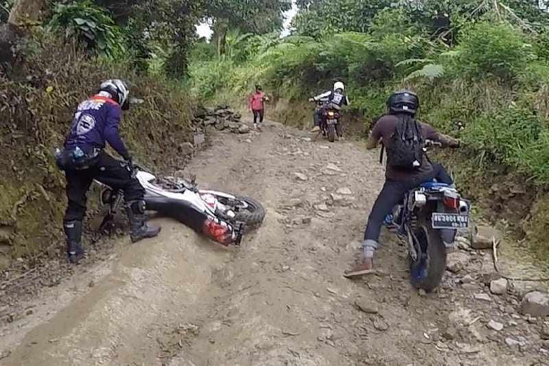 Tak hanya jalan beraspal yang mereka lalui, medan jalan tanah berbukit pun harus dilalui oleh para peserta. Jatuh dan bangun selama perjalanan jadi warna tersendiri bagi para bikers yang ikut dalam touring ini.