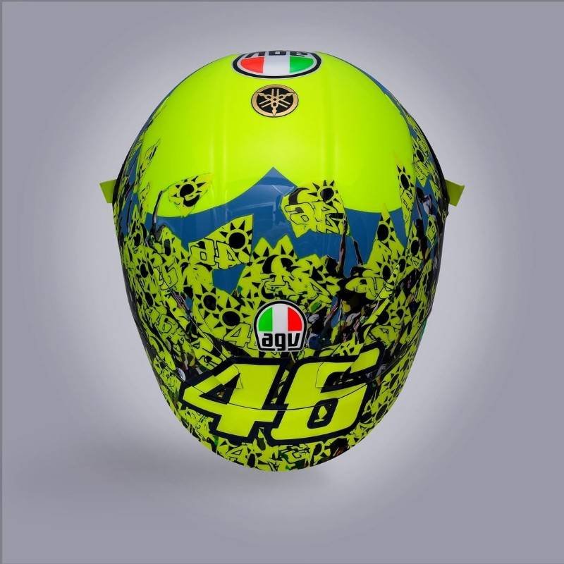“Desain ini telah didedikasikan untuk para penggemar Valentino Rossi. Konsep dasarnya adalah foto asli dari tribun, jadi beberapa penggemar mungkin melihat dirinya terpantul di dalamnya,” kata Aldo Drudi yang merancang desain corak helm itu.
