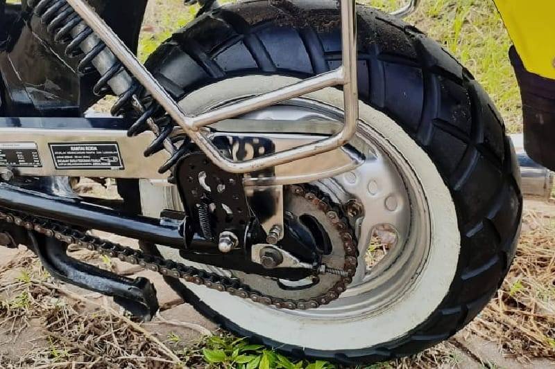 Untuk kenyamanan saat dikendarai, Bro Bambang menggunakan suspense bekas skuter matik Kymco untuk bagian depan dan shockbreaker bekas Yamaha Vega untuk bagian belakang.